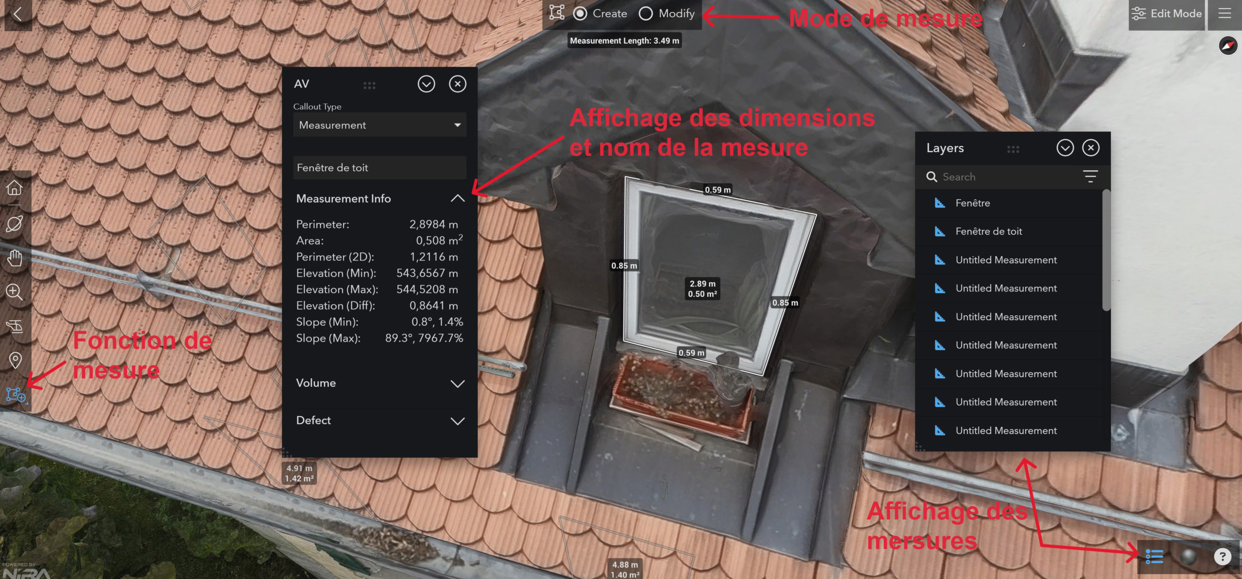 - Fonctions de mesures de distance, périmètre, surface, volume, altitude, dénivelé et pente en cliquant sur l’icone